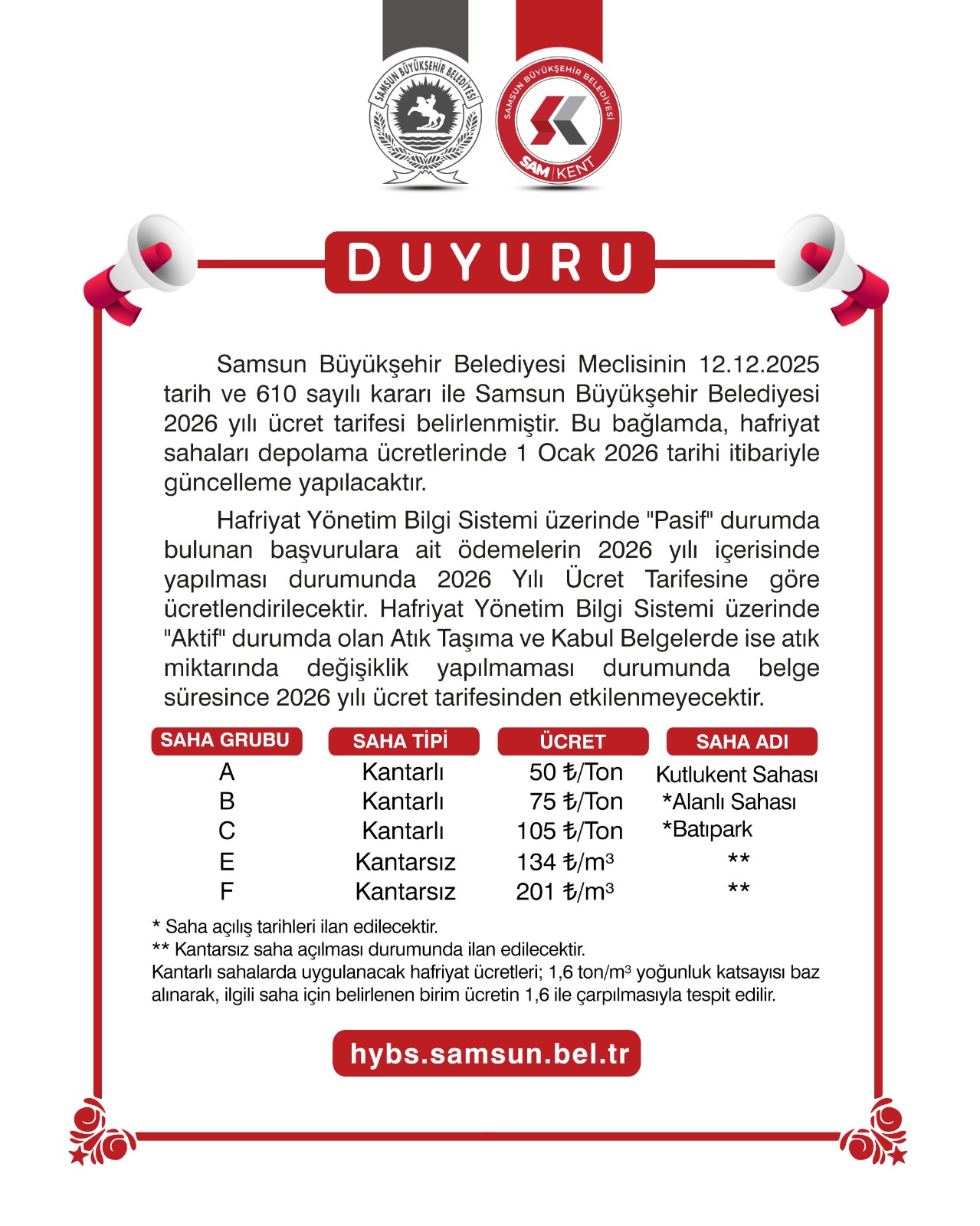 Samsun Büyükşehir Belediyesi Meclis Kararı gereği, 16 Haziran 2025 tarihi itibarıyla hafriyat sahalarının işletimi…